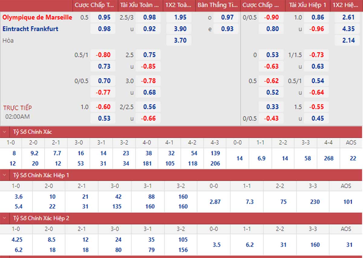 Về đối đầu, hai đội mới gặp nhau 2 lần và Frankfurt đều giành chiến thắng. Nhưng với phong độ đang lên cao, nhiều khả năng Marseille sẽ tìm được chiến thắng cho riêng mình.