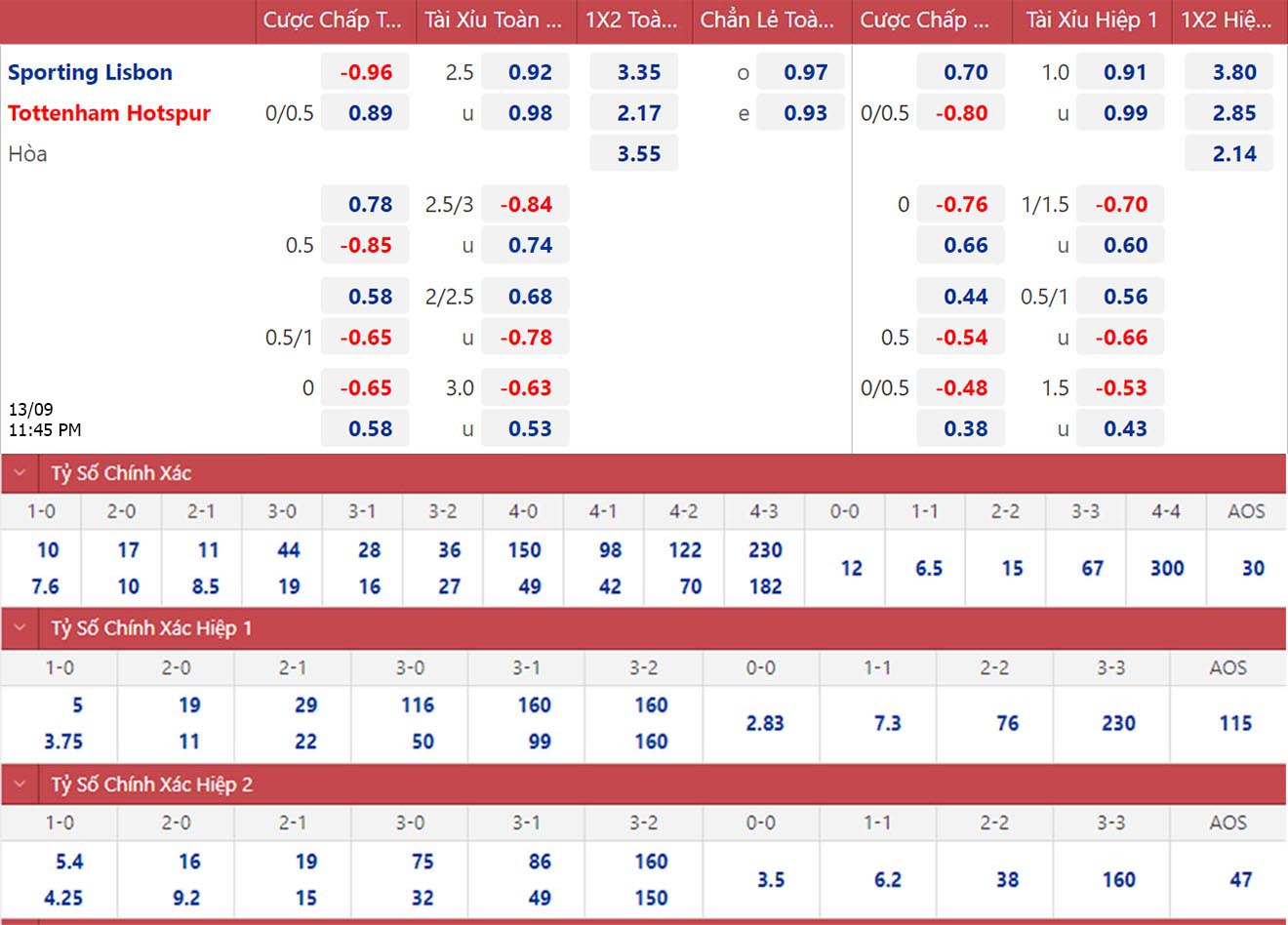 * 23h45, 13/9: Sporting Lisbon vs Tottenham