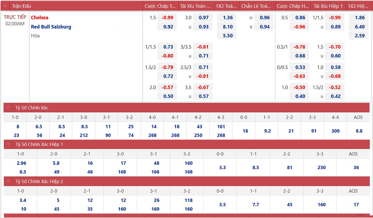 * Tỷ lệ kèo 90 phút: Chelsea 0 : 1 1/2 Red Bull Salzburg