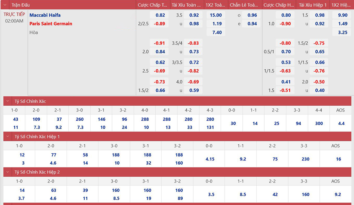 * Tỷ lệ/kèo 90 phút: Maccabi Haifa 2 1/4 : 0 PSG