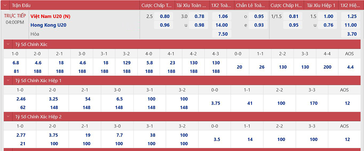 * Tỷ lệ/kèo 90 phút: U20 Việt Nam 0 : 1 1/2 U20 Hồng Kông