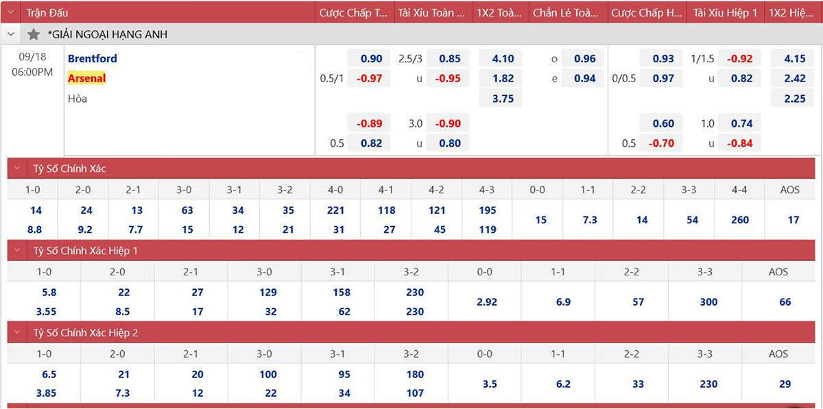 * Tỷ lệ kèo 90 phút: Brentford 3/4: 0 Arsenal