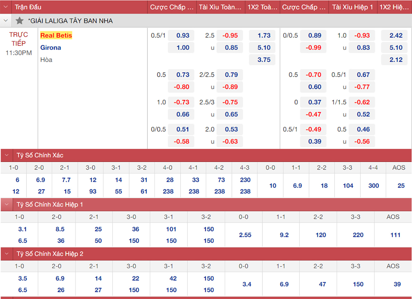 Betis nhiều khả năng thắng Girona. Real Betis đang xếp thứ 3 trên BXH và được đánh giá cao hơn so với Girona, CLB đứng thứ 8.