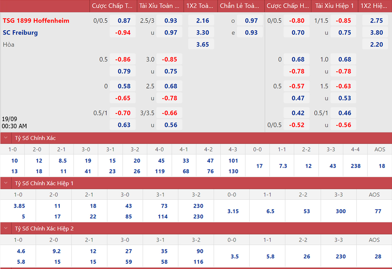 * 02h00, 19/9: Hoffenheim vs Freiburg