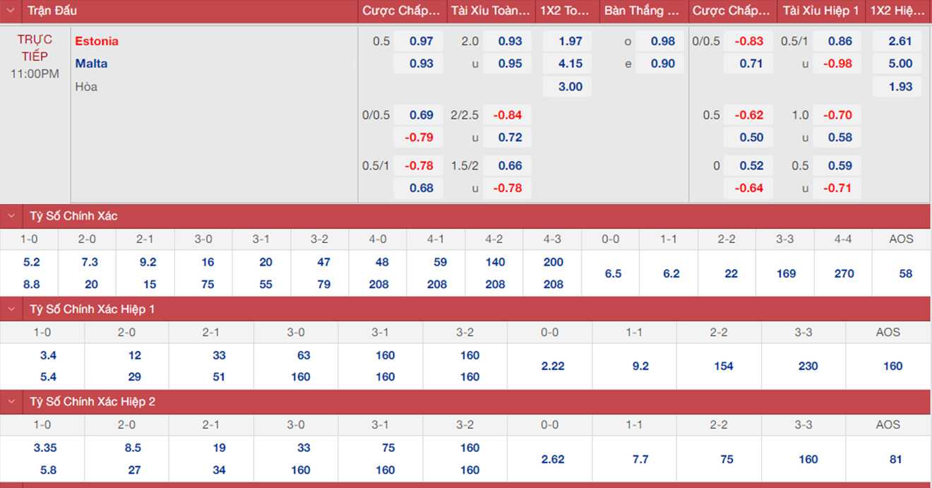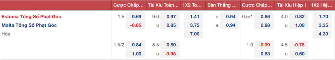 Hai lần gần nhất Estonia gặp Malta, tổng số bàn thắng đều vượt mốc 2,5 bàn. Do vậy trận đấu tới sẽ có nhiều bàn thắng.