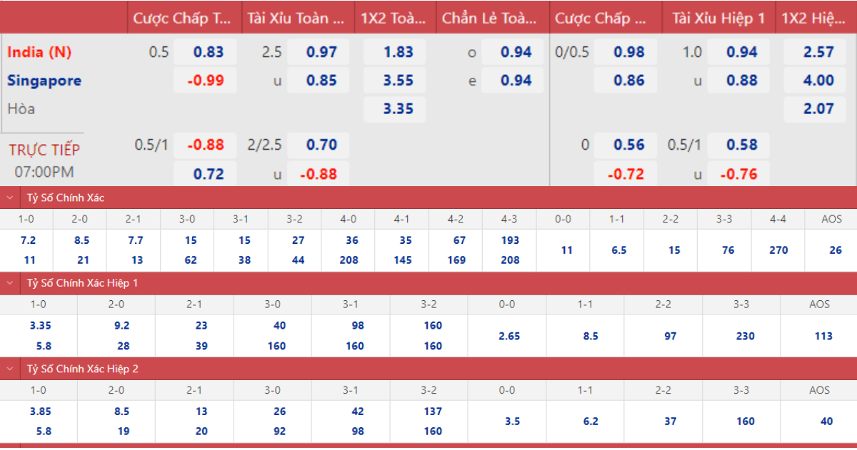 * Tỷ lệ kèo 90 phút: Ấn Độ 0 : 3/4 Singapore