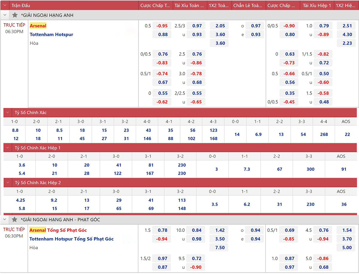 * Tỷ lệ kèo 90 phút: Arsenal 0 : 1/2 Tottenham