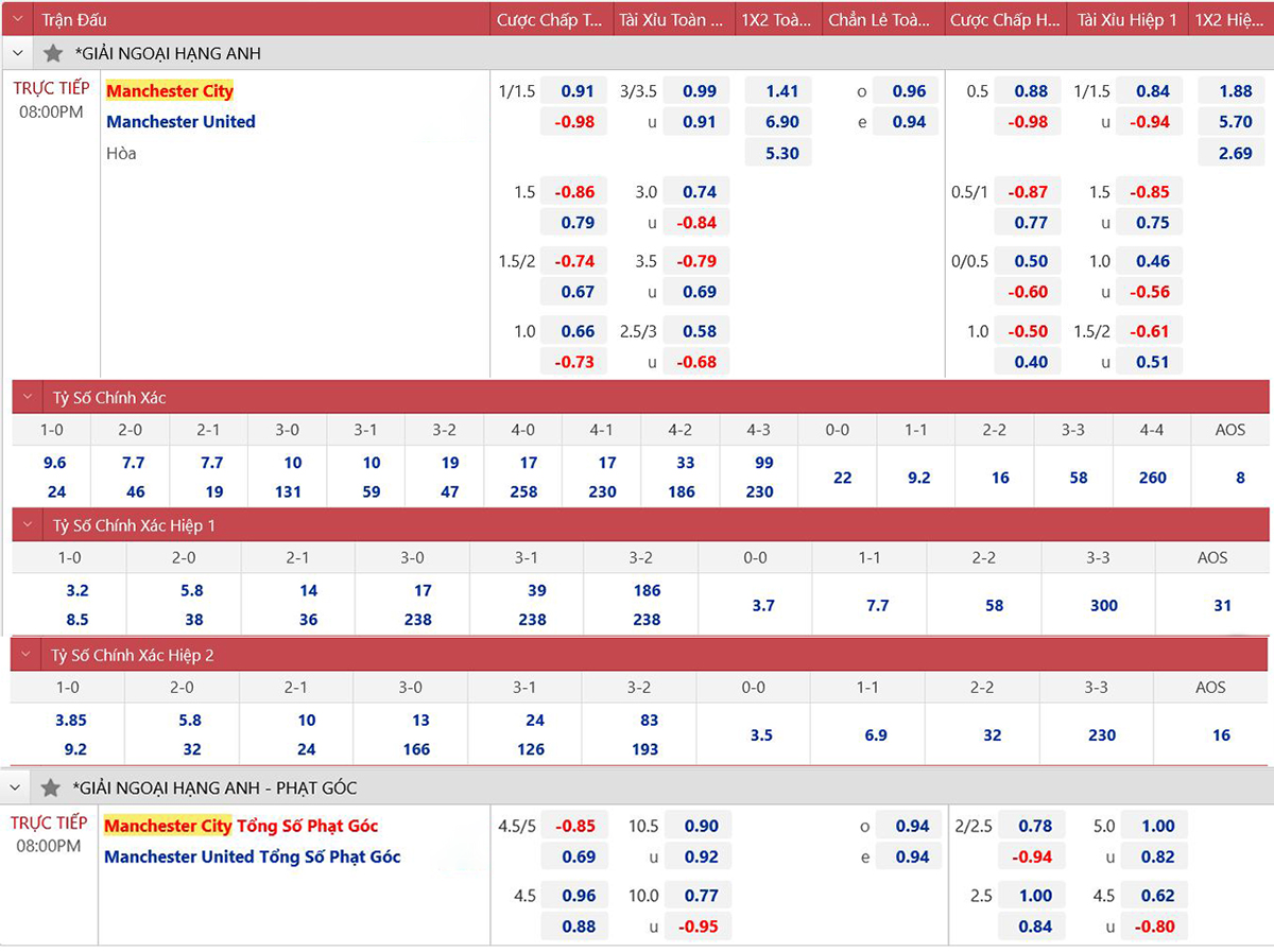 * Tỷ lệ kèo 90 phút: Man City 0 : 1 1/2 Man United