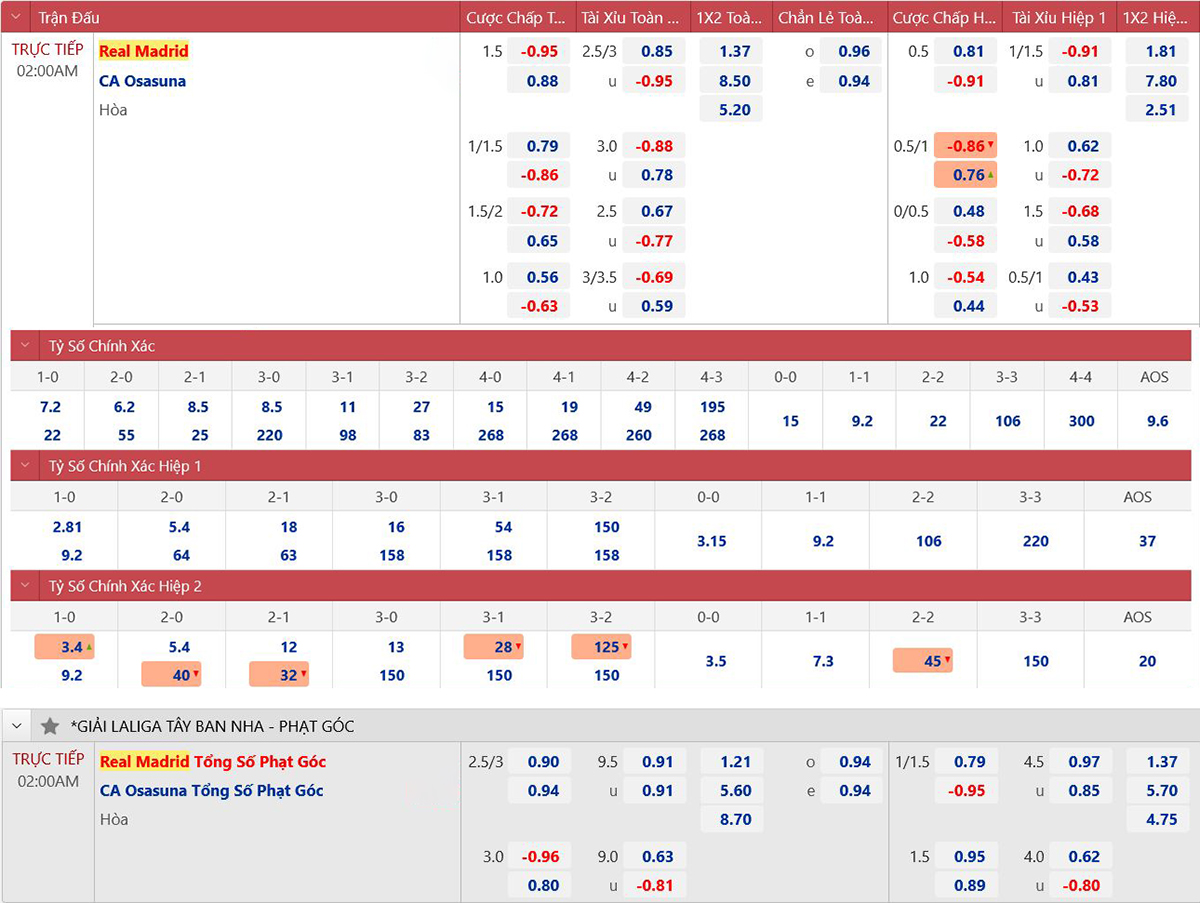 * Tỷ lệ/kèo 90 phút: Real Madrid 0 : 1 1/2 Osasuna