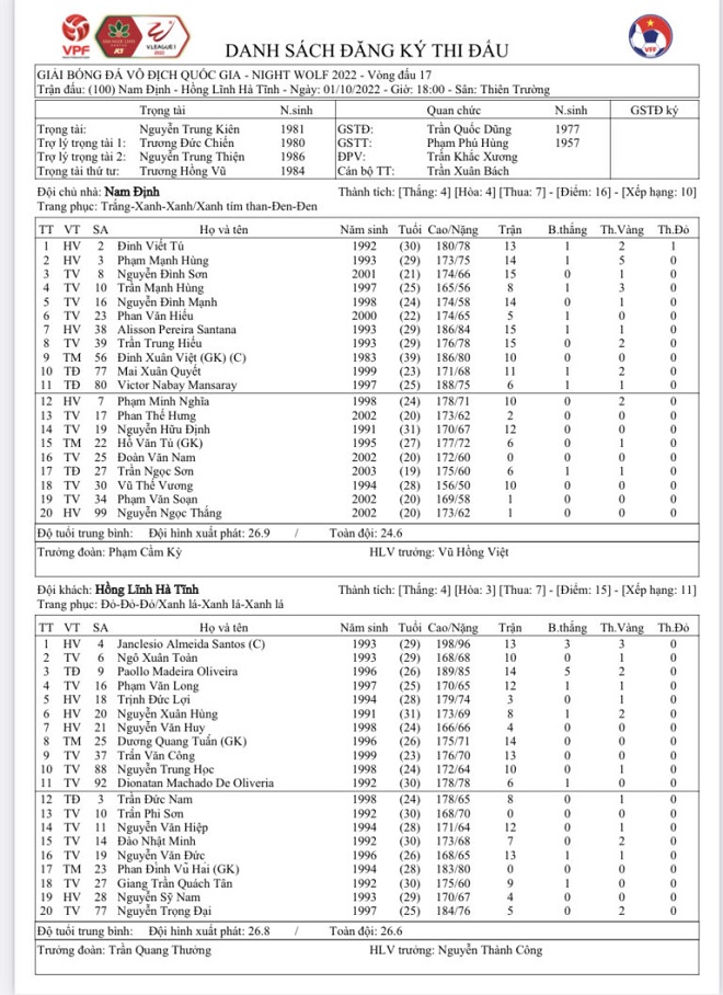 Đội hình ra sân Nam Định vs Hà Tĩnh