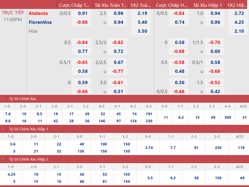 Trong sáu trận đấu gần đây nhất của họ, Atalanta đã thắng bốn và hòa hai. Fiorentina, trong khi đó, đã thắng một, hòa ba và thua hai trong sáu trận gần nhất.