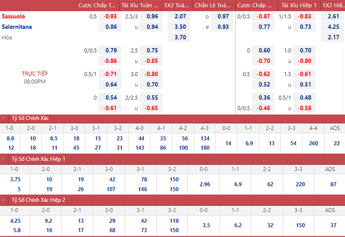 Với thực lực và đội hình ngang ngửa, rất có thể Sassuolo và Salernatina sẽ cầm chân nhau vào Chủ Nhật. Đây được dự đoán là một trận hòa với ít bàn thắng xuất hiện.