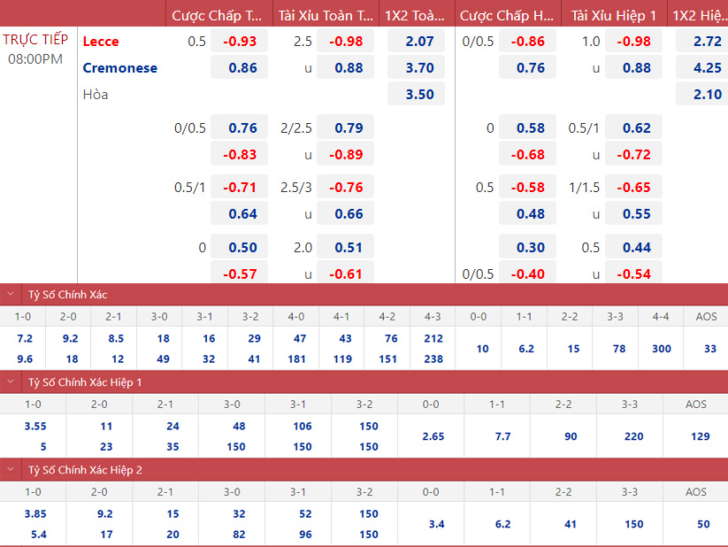 Trong sáu trận đấu gần đây nhất của họ, Lecce đã thắng một, hòa ba và thua hai. Trong khi đó, Cremonese đã hòa 2 và thua 4 trong 6 trận gần nhất.