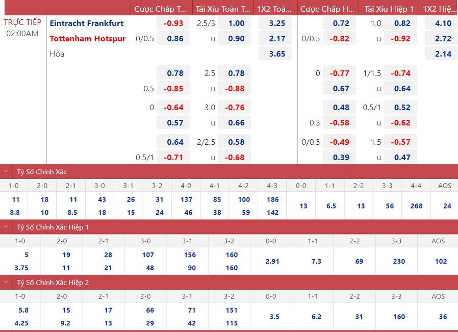 Trong 6 trận gần nhất trên mọi đấu trường, Frankfurt đã thắng 4 và thua 2. Tottenham đã thắng ba, hòa một và thua hai trong sáu trận gần nhất.
