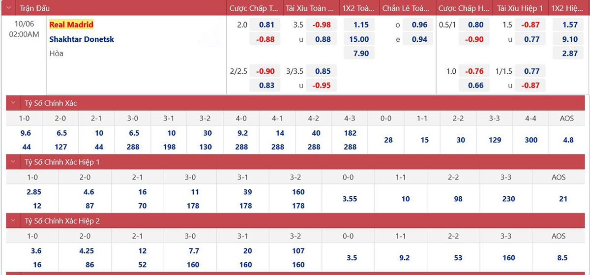 * Tỷ lệ/kèo 90 phút: Real Madrid 0 : 2 1/4 Shakhtar Donetsk