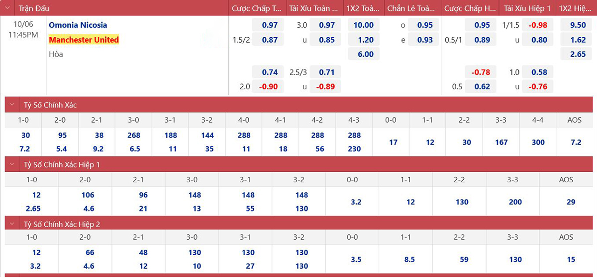 * Tỷ lệ kèo 90 phút: Omonia 1 3/4 : 0 Man United