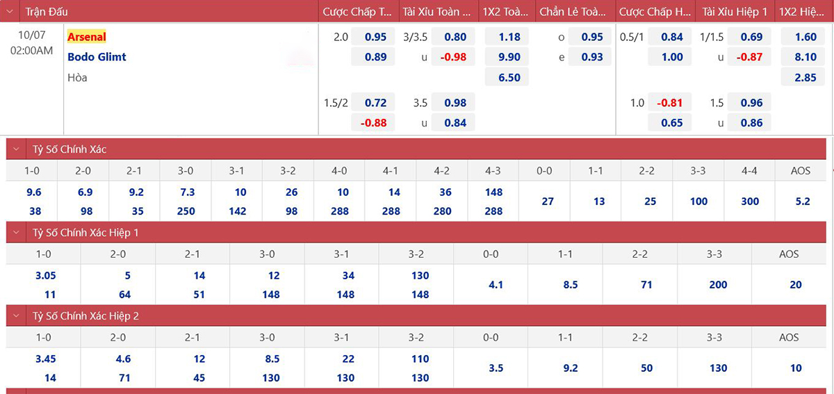 * Tỷ lệ kèo 90 phút: Arsenal 0 : 2 Bodo Glimt