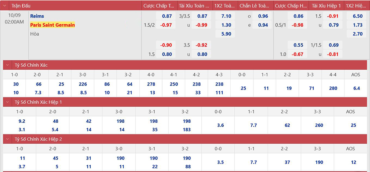 * Tỷ lệ kèo 90 phút: Reims 1 3/4 : 0 PSG