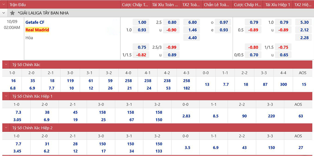 * Tỷ lệ/kèo 90 phút: Getafe 1 : 0 Real Madrid