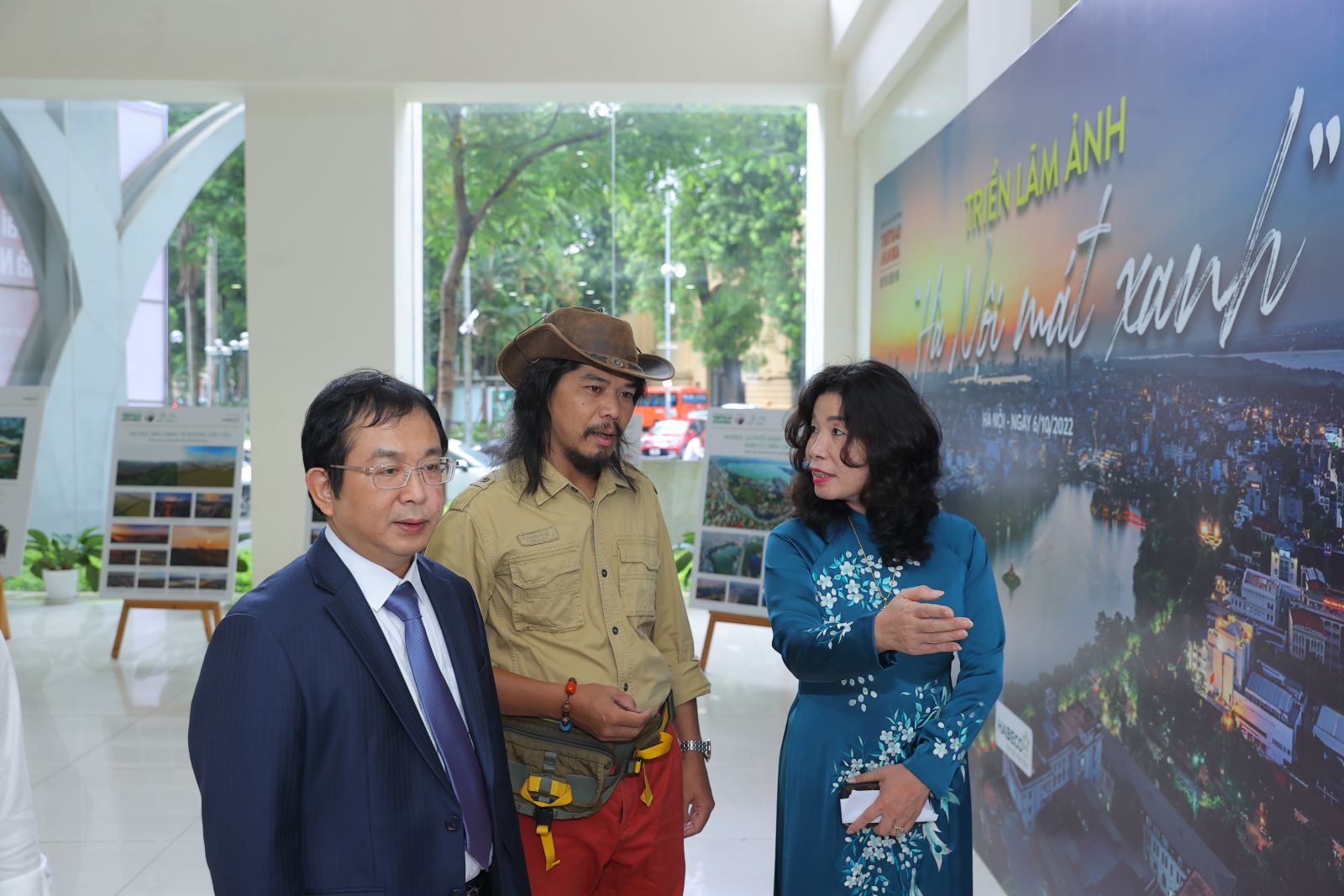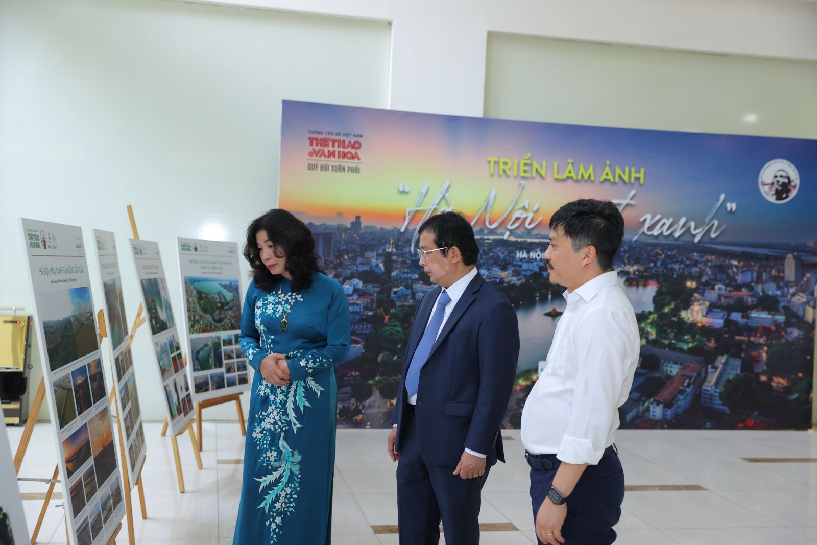 Từ trái qua: Bà Trần Thị Vân Anh - Phó Giám đốc Sở VHTT Hà Nội, ông Nguyễn Tuấn Hùng - Phó Tổng giám đốc TTXVN và ông Lê Xuân Thành - Tổng biên tập báo Thể thao và Văn hóa tham quan triển lãm. Ảnh: Hòa Nguyễn