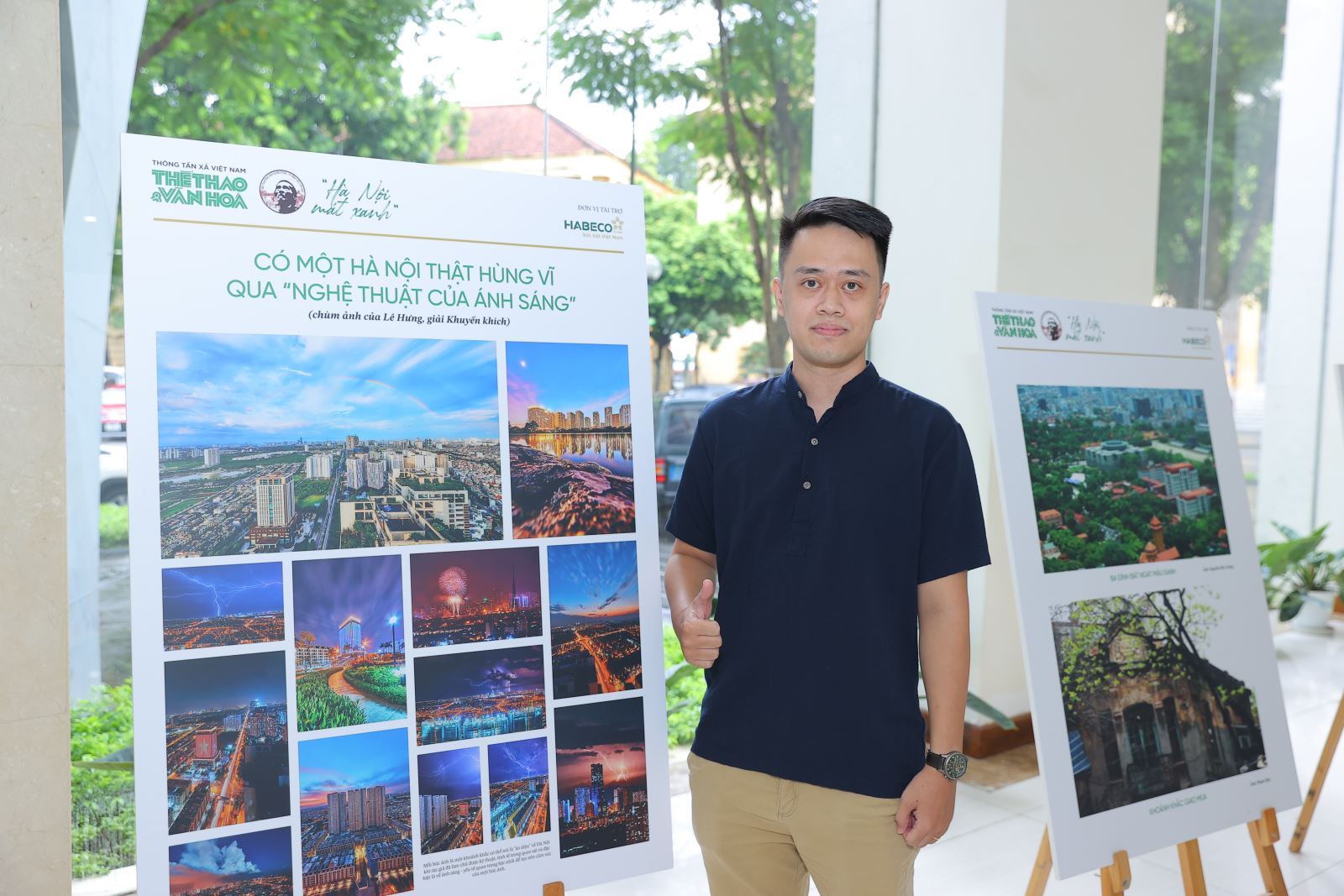 Tay may Lê Hưng bên chùm ảnh đoạt giải Khuyến khích của mình mang tên "Có một Hà Nội thật hùng vĩ qua nghệ thuật của ánh sáng". Ảnh: Hòa Nguyễn