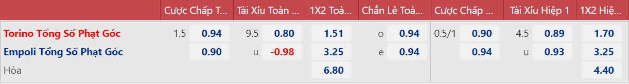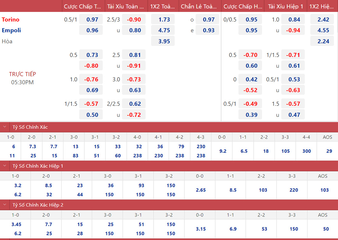 Torino chỉ thắng 1 trong 5 trận gần nhất. Vì thế, tỷ lệ chấp 3/4 của Torino trong trận đấu này là một tỷ lệ bị đánh giá hơi cao. Empoli dưới thời HLV Zanetti vẫn luôn là đội bóng tập trung phòng ngự chặt chẽ. Do vậy, để có thể thắng Empoli với cách biệt 2 bàn không phải chuyện dễ dàng.