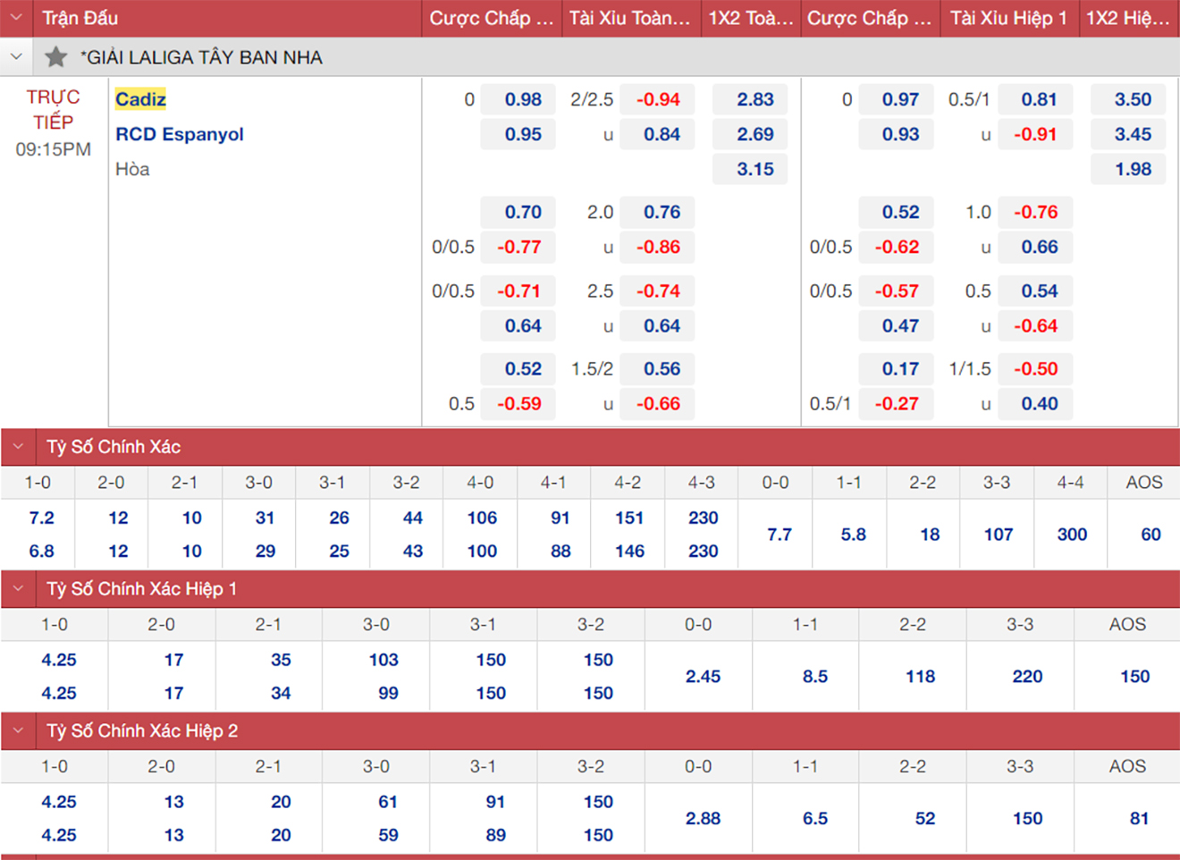 Cadiz nhiều khả năng hoà Espanyol. Cadiz đang xếp thứ 19 trên BXH và đối mặt nguy cơ xuống hạng. Sau khi thua 5 trận liên tiếp, Cadiz có dấu hiệu hồi sinh với 1 trận thắng và 1 trận hoà trong 2 trận gần nhất. Tuy nhiên để thoát khỏi nhóm “cầm đèn đỏ”, họ cần thắng Espanyol ở trận tới.