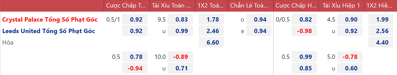 Trên sân nhà mùa này, Crystal Palace chỉ thắng 1 trận, còn lại là hòa (1) và thua. Nhưng Leeds đá sân khách còn tệ hơn khi chỉ giành 1/9 điểm tối đa (1 hòa, 2 thua). Về phong độ, hai đội khá tương đương nhau khi đều thắng 1, hòa 3 và thua 2 ở 6 trận gần nhất. Sẽ không ngạc nhiên nếu hai đội kết thúc 90 phút với tỷ số hòa.