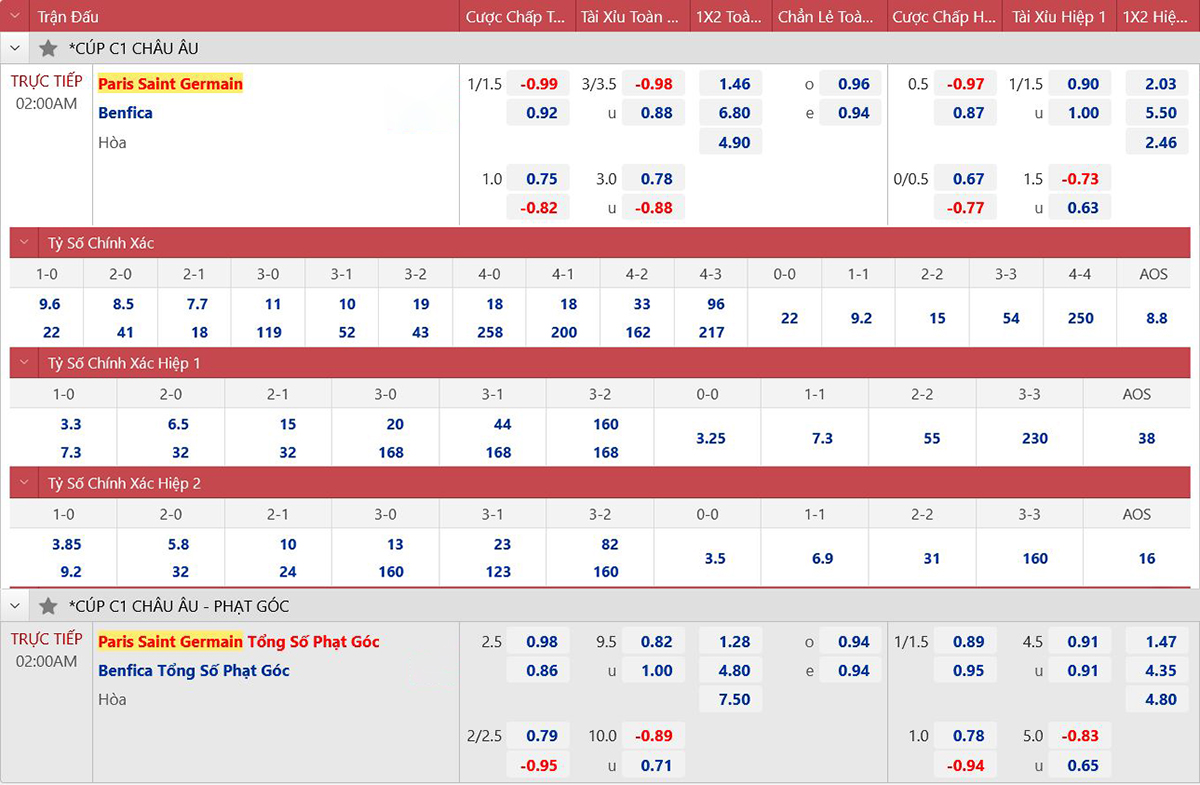 * Tỷ lệ kèo 90 phút: PSG 0 : 1 1/2 Benfica