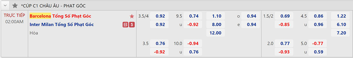 * Tỷ lệ kèo 90 phút Barcelona 0 : 1 1/4 Inter Milan