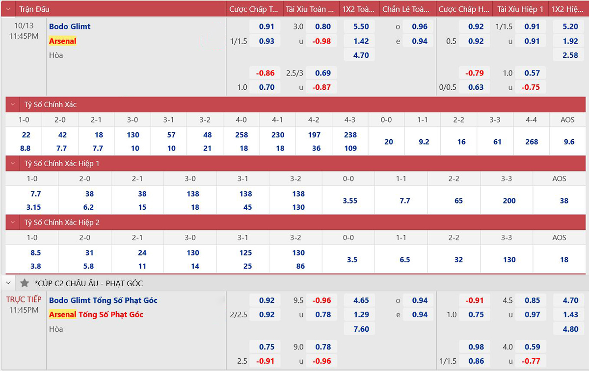 * Tỷ lệ kèo 90 phút: Bodo Glimt 1 1/4 : 0 Arsenal