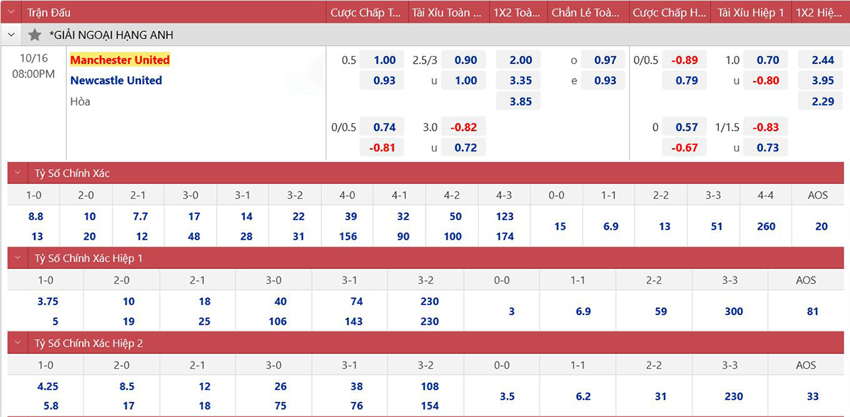 * Tỷ lệ kèo 90 phút: Man United 0 : 1/2 Newcastle
