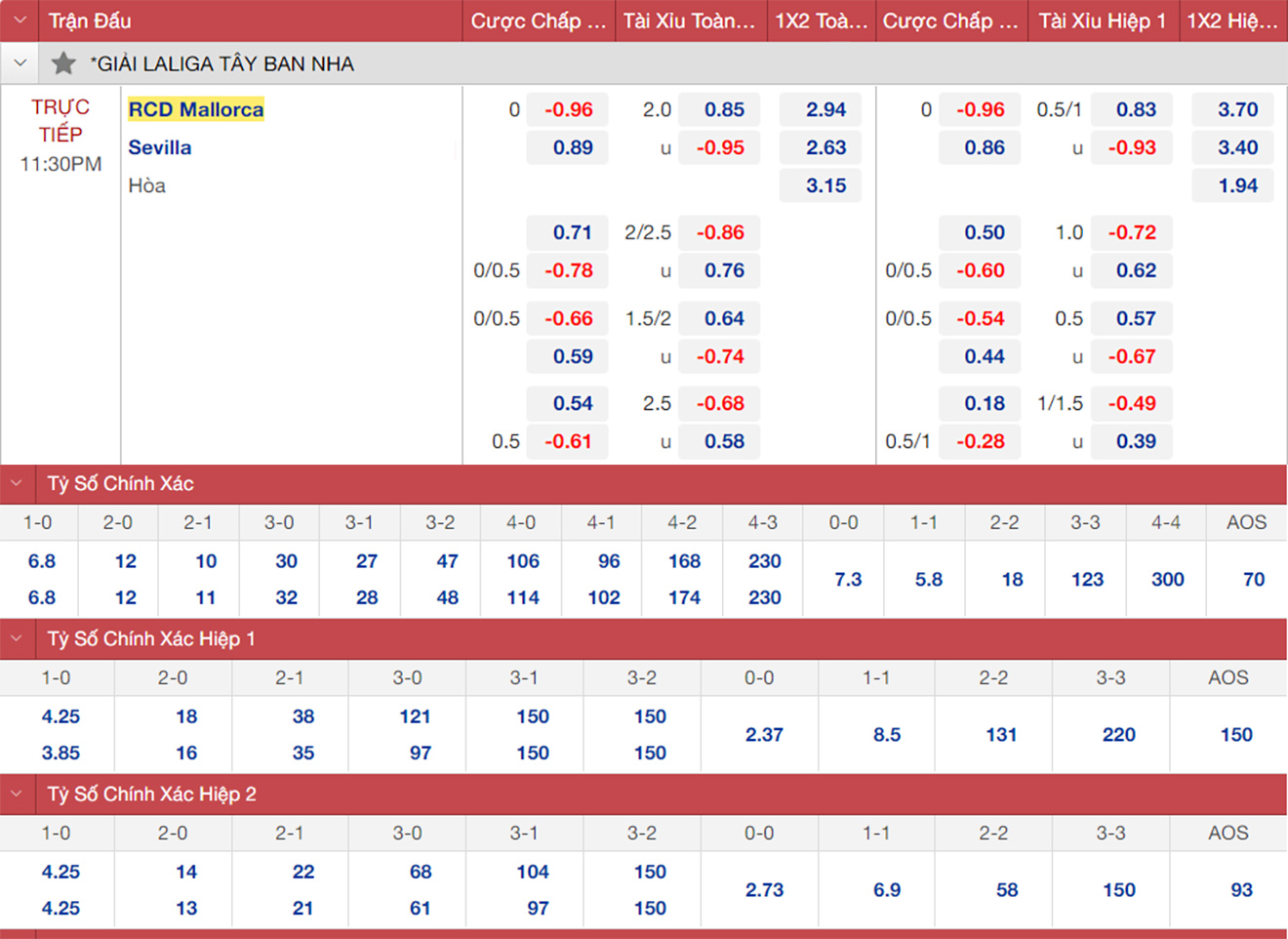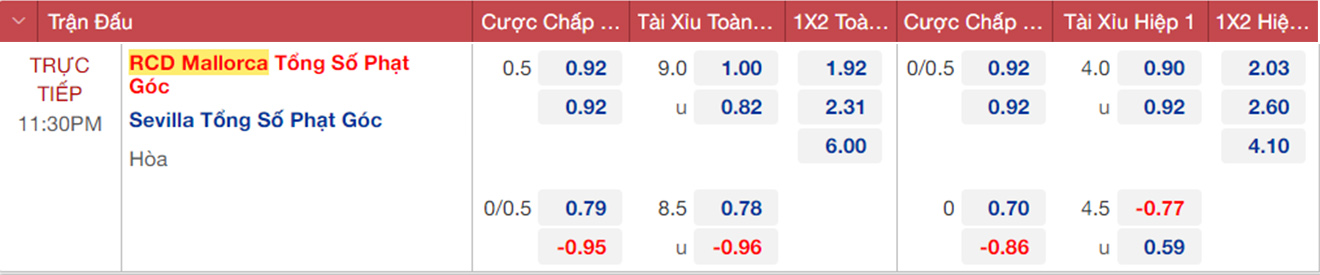 Sevilla nhiều khả năng hoà trước Mallorca. Sevilla đang rất khát khao giành thắng lợi sau khi trải qua 6 trận gần nhất toàn hoà và thua. Phong độ kém cỏi đó khiến Sevilla tụt xuống nhóm “cầm đèn đỏ” và đối diện nguy cơ xuống hạng.