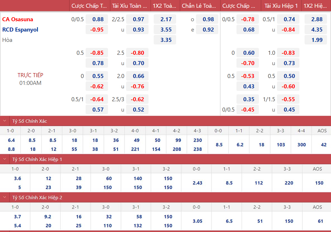 Osasuna và Espanyol đều chỉ có 1 trận thắng trong 5 trận gần nhất của họ. Xét về thành tích đối đầu, Osasuna không thua trước Espanyol trên sân nhà trong 2 trận gần nhất. Những thống kê này cho thấy trận đấu giữa Osasuna và Espanyol sẽ khó có nhiều bàn thắng diễn ra. Bên cạnh đó, khả năng giành chiến thắng của Osasuna cũng đang nhỉnh hơn.