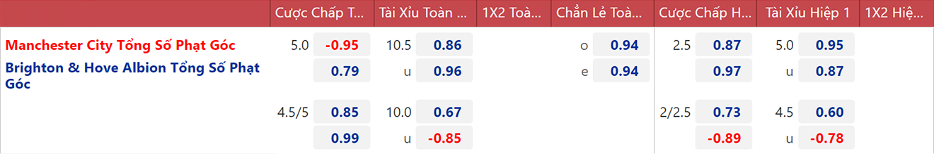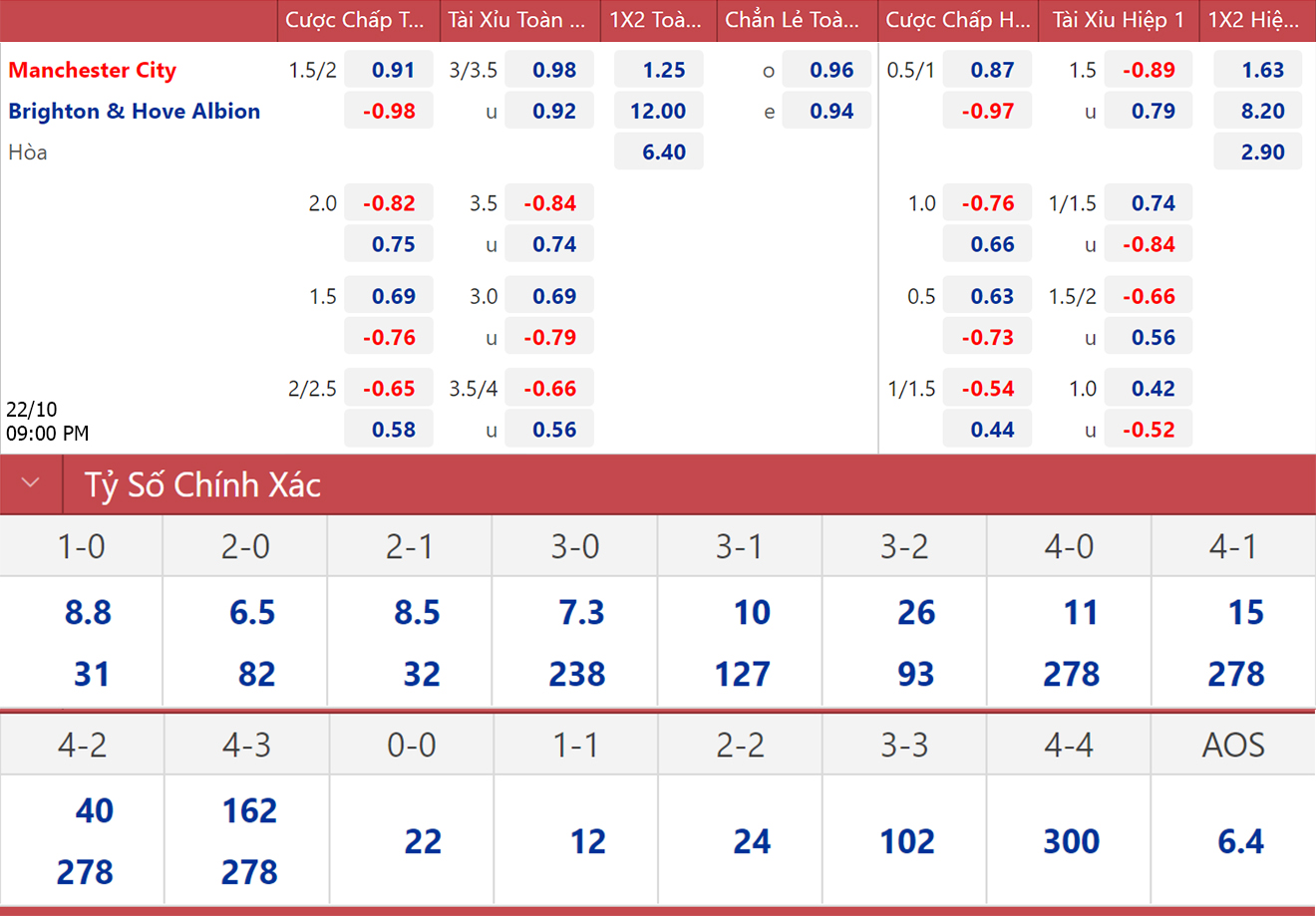 * Tỷ lệ kèo 90 phút: Man City 0 : 2 Brighton