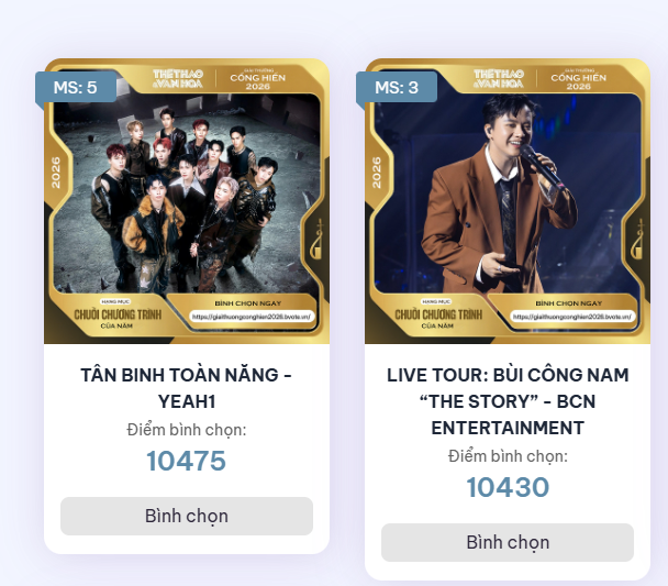 Vòng bình chọn này sẽ diễn ra từ 20h00' ngày 20/3/2026 đến 23h59' ngày 5/4/2026 tại địa chỉ https://giaithuongconghien2026.bvote.vn
