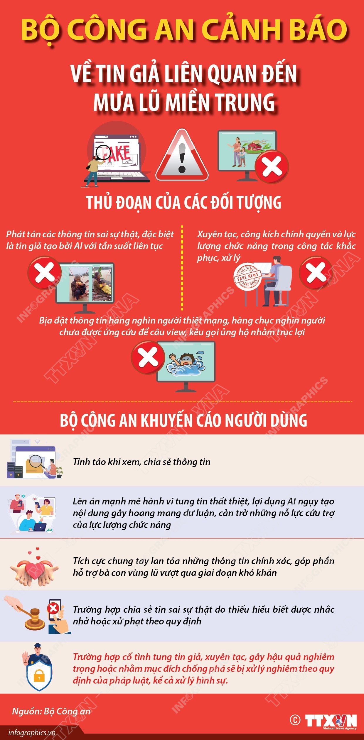 Ngày 23/11/2025, Bộ Công an phát cảnh báo về tình trạng phát tán các thông tin sai sự thật (đặc biệt là tin giả tạo bởi AI) liên quan đến mưa lũ miền Trung.