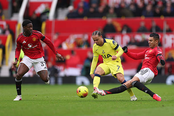 40': KHÔNG VÀO! Casemiro đánh đầu hiểm hóc trong vòng cấm nhưng thủ môn Vicario của Tottenham đã kịp thời cứu thua. MU vẫn đang tăng cường sức ép.