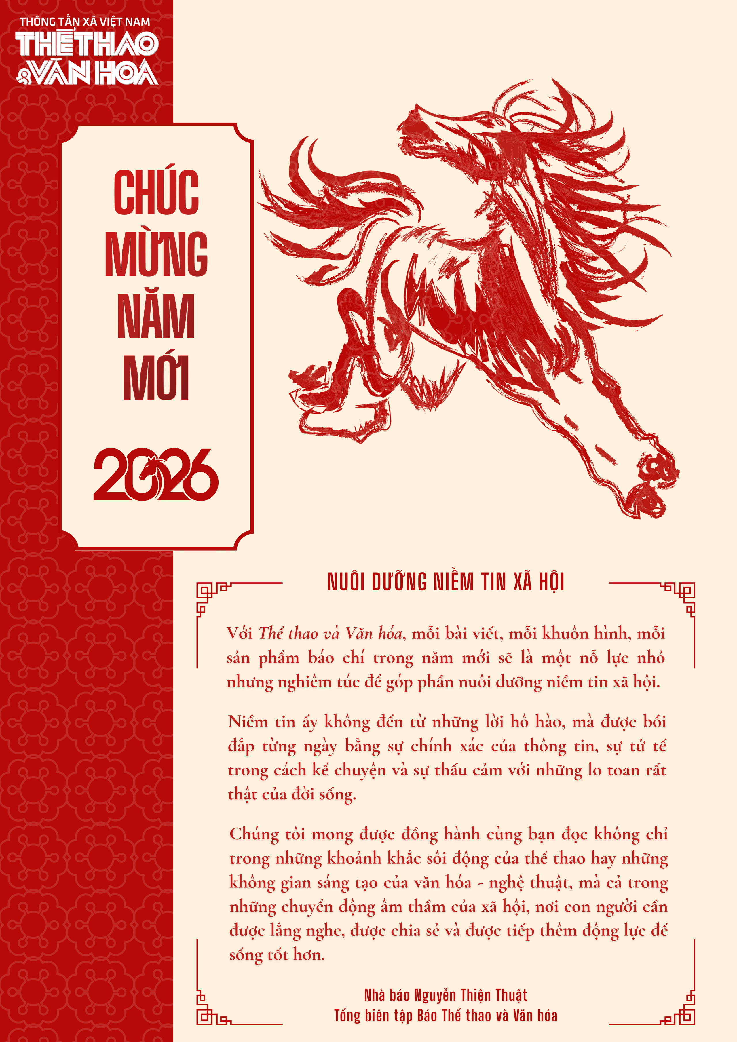 Nhân dịp năm mới 2026, Báo Thể thao và Văn hóa trân trọng cảm ơn bạn đọc trong và ngoài nước, các cộng tác viên, văn nghệ sĩ, vận động viên và những người đã luôn tin tưởng, sẻ chia và đồng hành. Chúng tôi mong tiếp tục được ở bên bạn đọc trong từng nhịp sống của năm mới – bình an hơn, tử tế hơn và nhiều hy vọng hơn.
