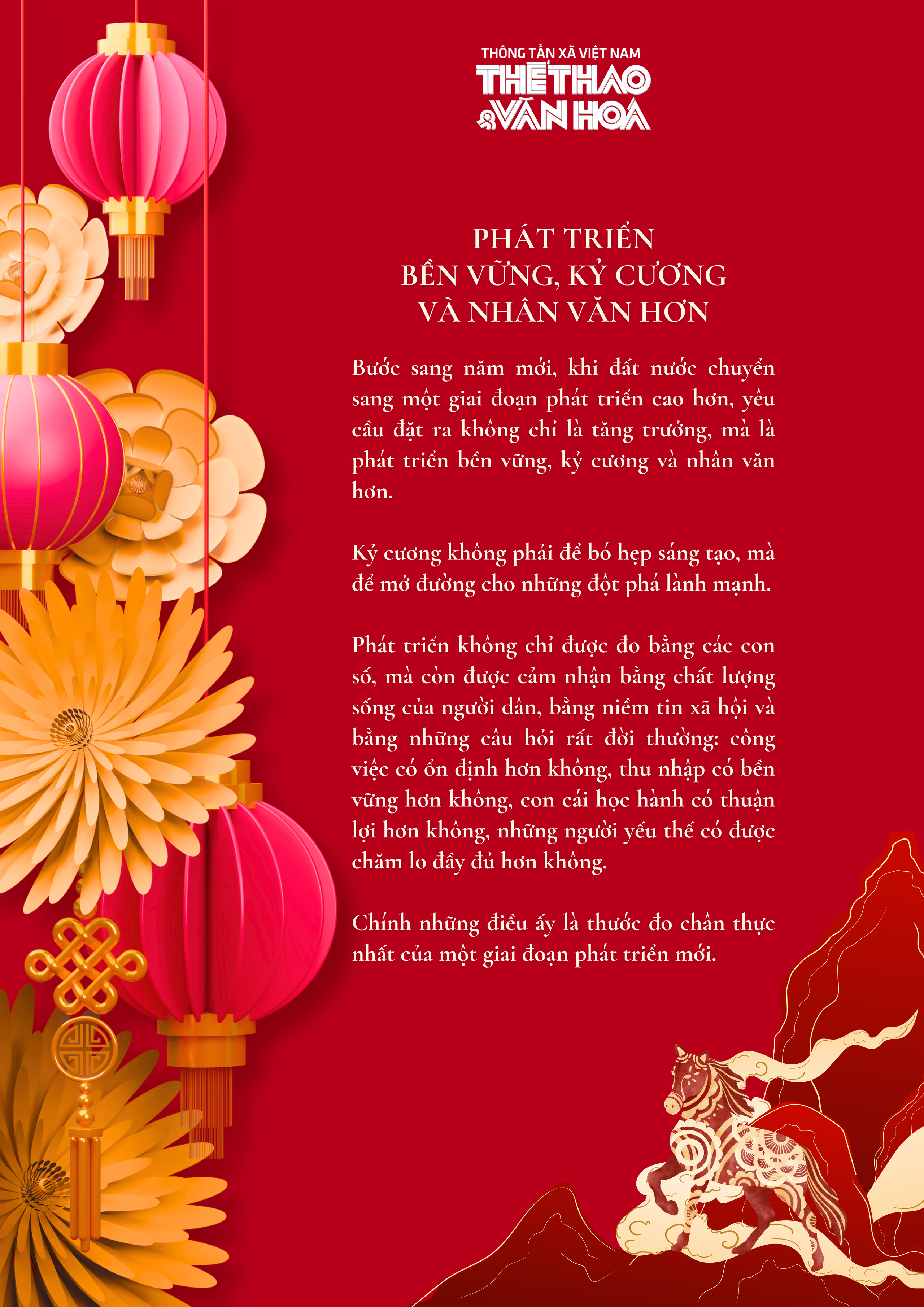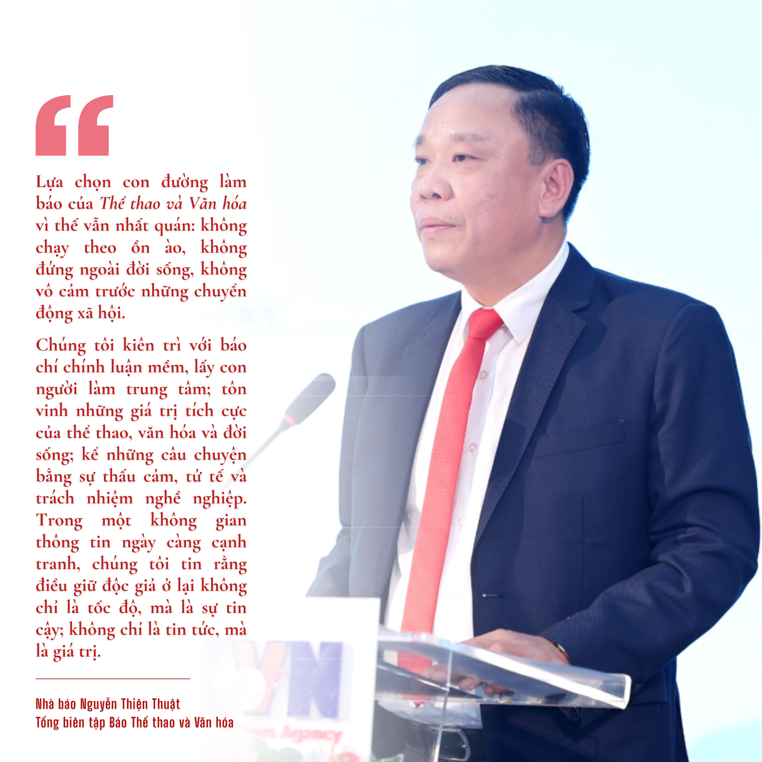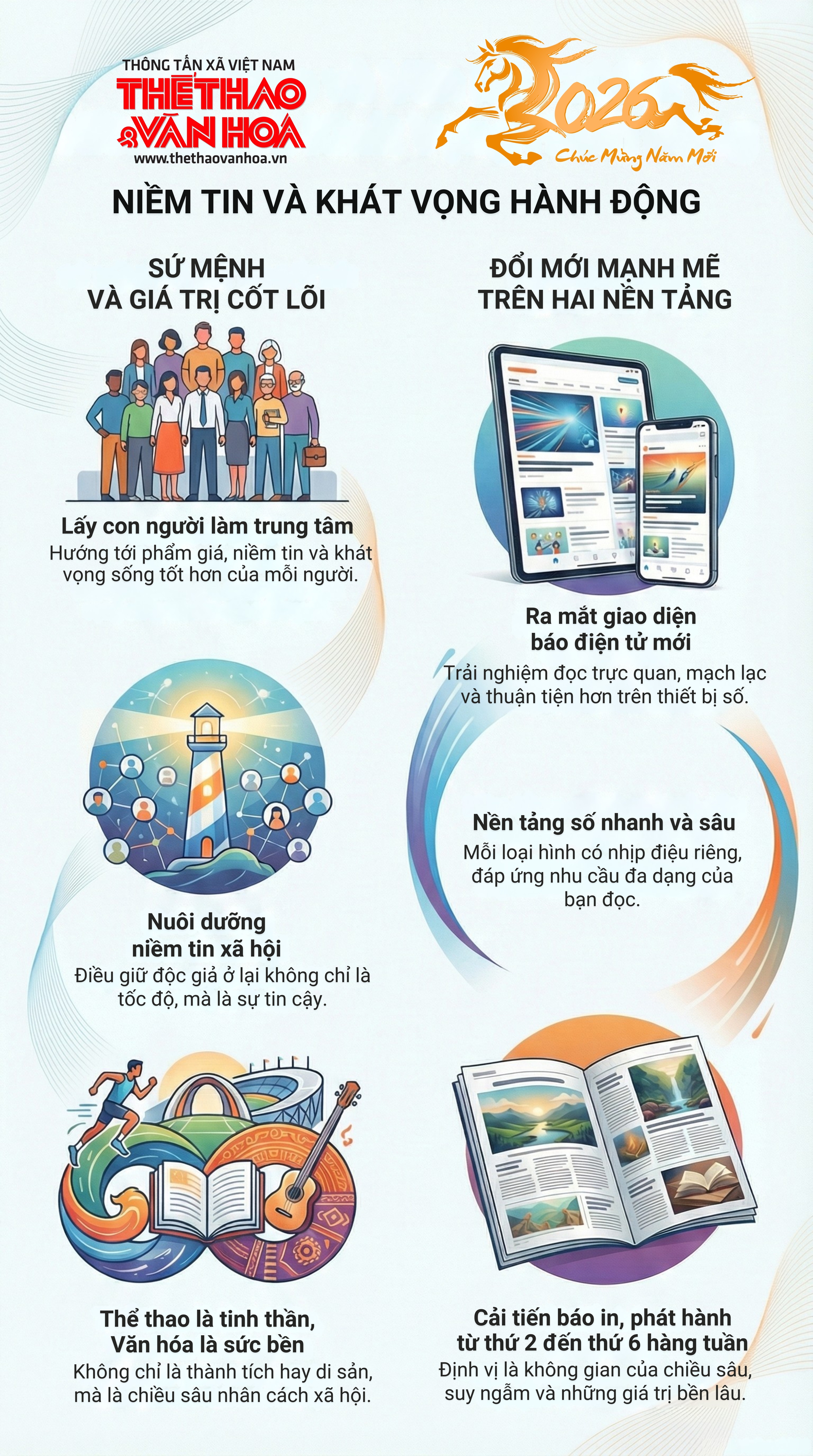 Trong dòng chảy chung đó, Báo Thể thao và Văn hóa (TTXVN) bước vào năm 2026 với ý thức rõ ràng hơn về sứ mệnh của mình. Chúng tôi tin rằng: thể thao không chỉ là thành tích, mà là tinh thần trung thực, bền bỉ và vượt lên chính mình; văn hóa không chỉ là di sản, mà là chiều sâu nhân cách và sức bền tinh thần của xã hội; và báo chí - nếu làm đến tận cùng - phải hướng tới con người, với phẩm giá, niềm tin và khát vọng sống tốt hơn.
