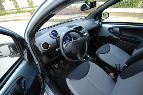 Nội thất giống Aygo nên thoáng với cách bố trí bảng điều khiển trung tâm gọn. Ghế lái chỉnh tay và độ lùi khá sâu, hợp với cả người to cao. Dù vô-lăng không kéo ra-vào mà chỉ gật-gù nhưng không khó để tìm được vị trí vừa tầm để điều khiển chân ga, chân côn và cần số. Vì thế, tài xế không bị mỏi và gò bó như Chery QQ3.