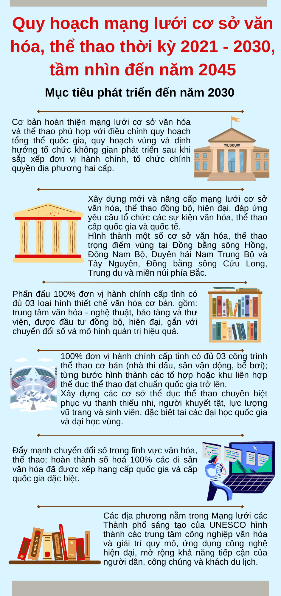 Bộ VHTTDL vừa ban hành Quyết định số 1226/QĐ - BVHTTDL về việc phê duyệt điều chỉnh quy hoạch mạng lưới cơ sở văn hóa và thể thao thời kỳ 2021-2030, tầm nhìn đến năm 2045.