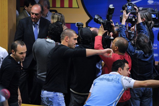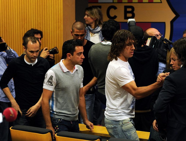 Các đội trưởng của Barca gồm Puyol, Xavi, Iniesta và Valdes tới phòng họp báo