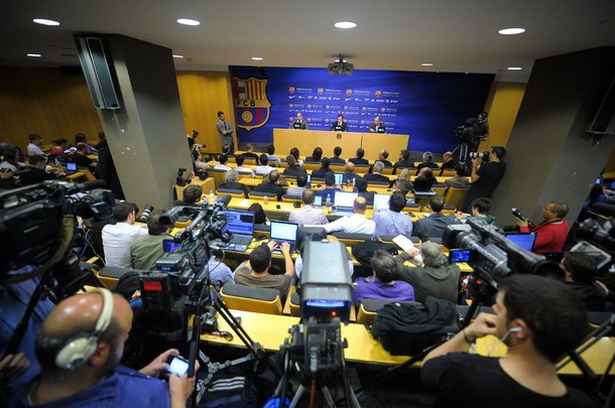 Các cầu thủ Barca tới phòng họp báo khá đông nhưng không có Messi