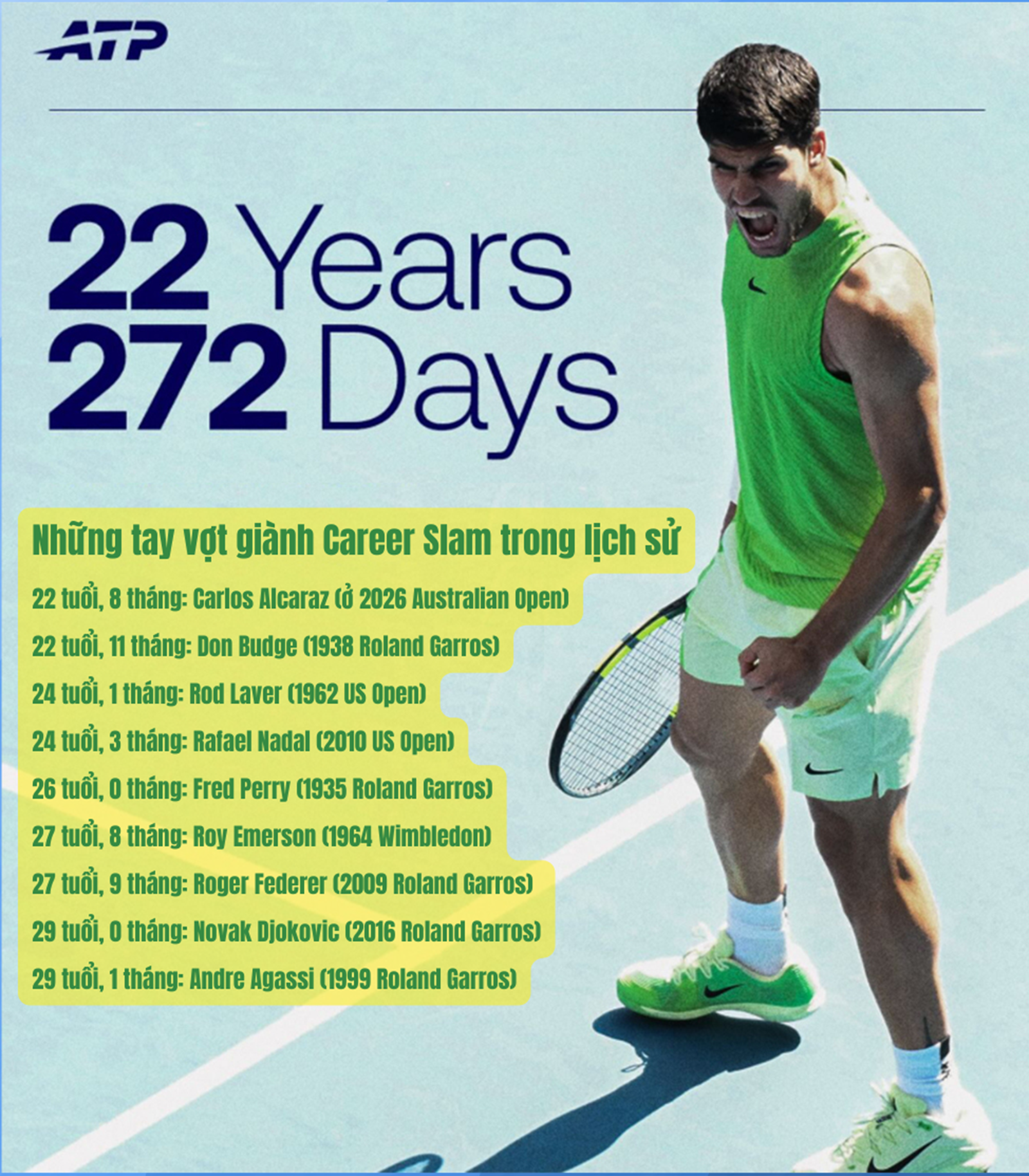 Với chức vô địch Australian Open 2026, Carlos Alcaraz đã đi vào lịch sử khi trở thành tay vợt trẻ nhất từ trước đến nay hoàn tất Career Grand Slam. Và anh lập kỳ tích ấy trước một huyền thoại, Novak Djokovic