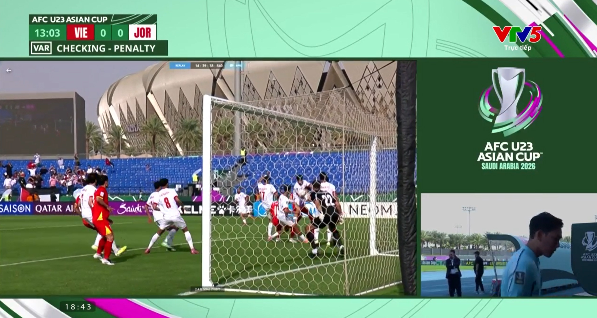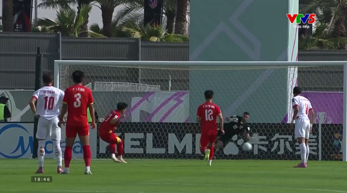 Trước đó, ở phút 11, tình huống gây tranh cãi đã khiến trọng tài phải rời sân để xem lại băng hình. Qua các góc quay chậm, lỗi chơi bóng bằng tay của cầu thủ U23 Jordan được xác định rõ ràng, mang về cơ hội quý giá cho U23 Việt Nam.