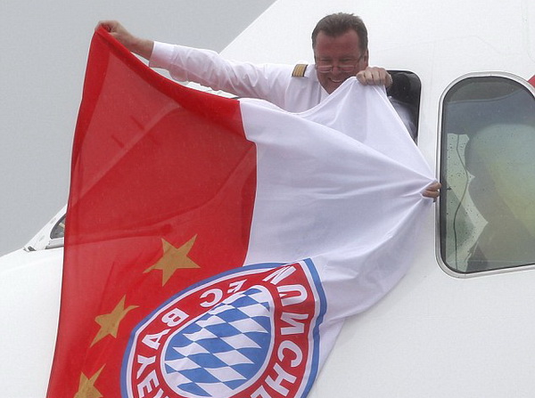 Các phi công hào hứng vẫy cờ của Bayern qua cửa sổ.