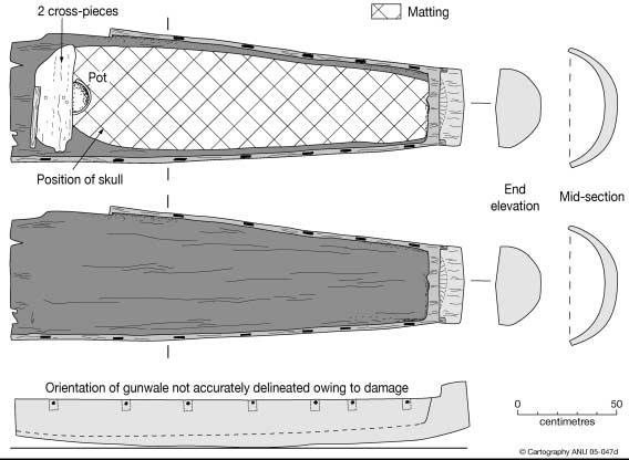 Từ trái sang: Các chuyên gia bảo tàng quốc gia Úc đang xử lý bảo quản nửa thân thuyền làm quan tài; Hình vẽ chi tiết nửa đuôi chiếc thuyền dùng làm quan tài