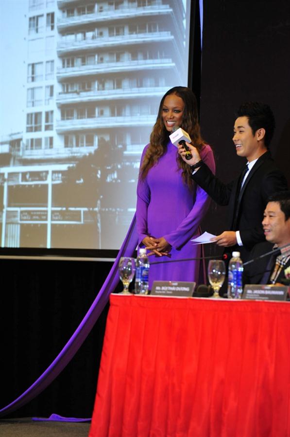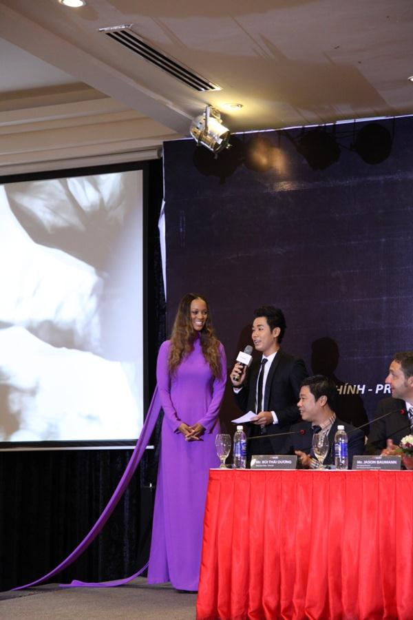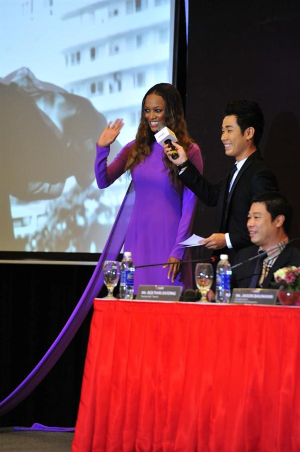 (TT&VH Online) - Xuất hiện trong buổi ra mắt báo giới sáng nay (8/1) tại TP HCM, siêu mẫu Tyra Banks đã thỏa ao ước được khi diện chiếc áo dài màu tím cách điệu, thướt tha của nhà thiết kế Võ Việt Chung.