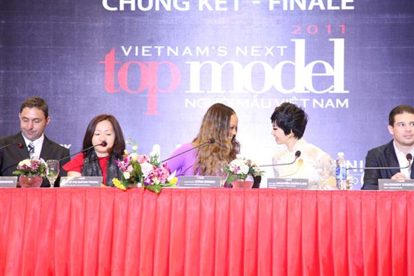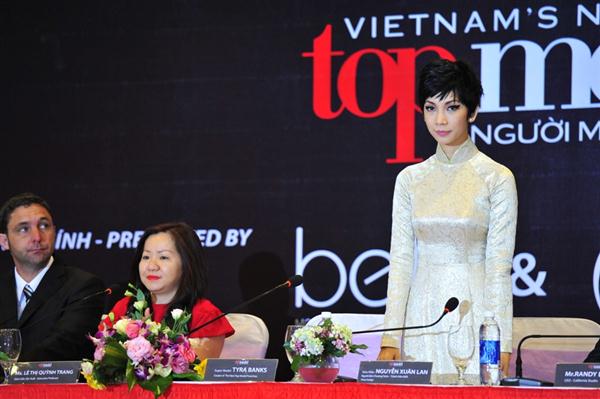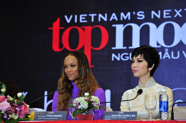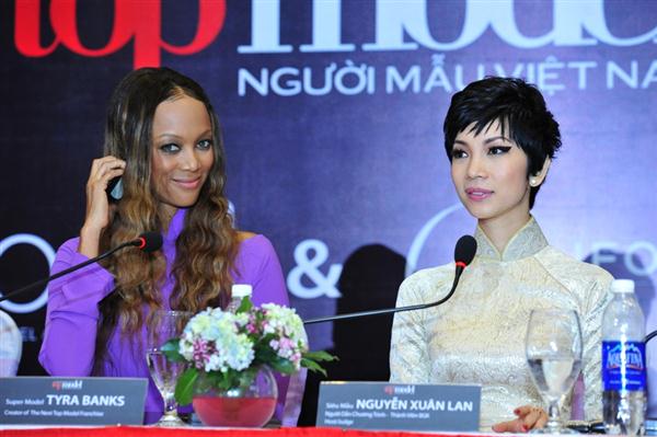 Siêu mẫu Xuân Lan cũng diện một chiếc áo dài màu kem duyên dáng, chăm chú nghe Tyra chia sẻ American's Next Top Model và top 3 Vietnam's Next Top Model.